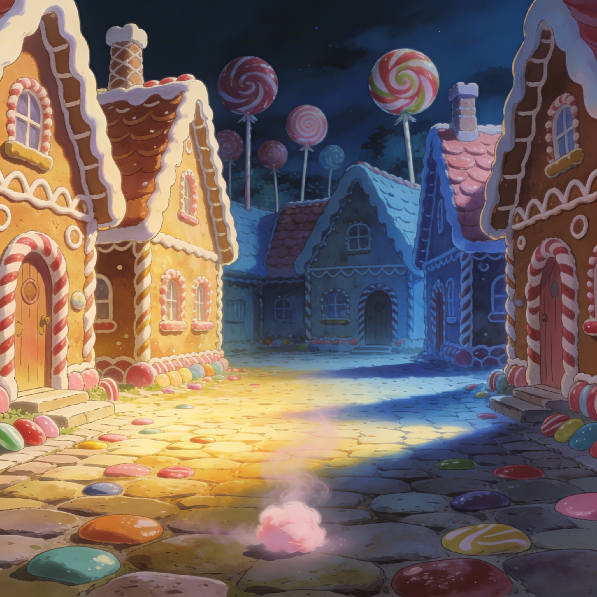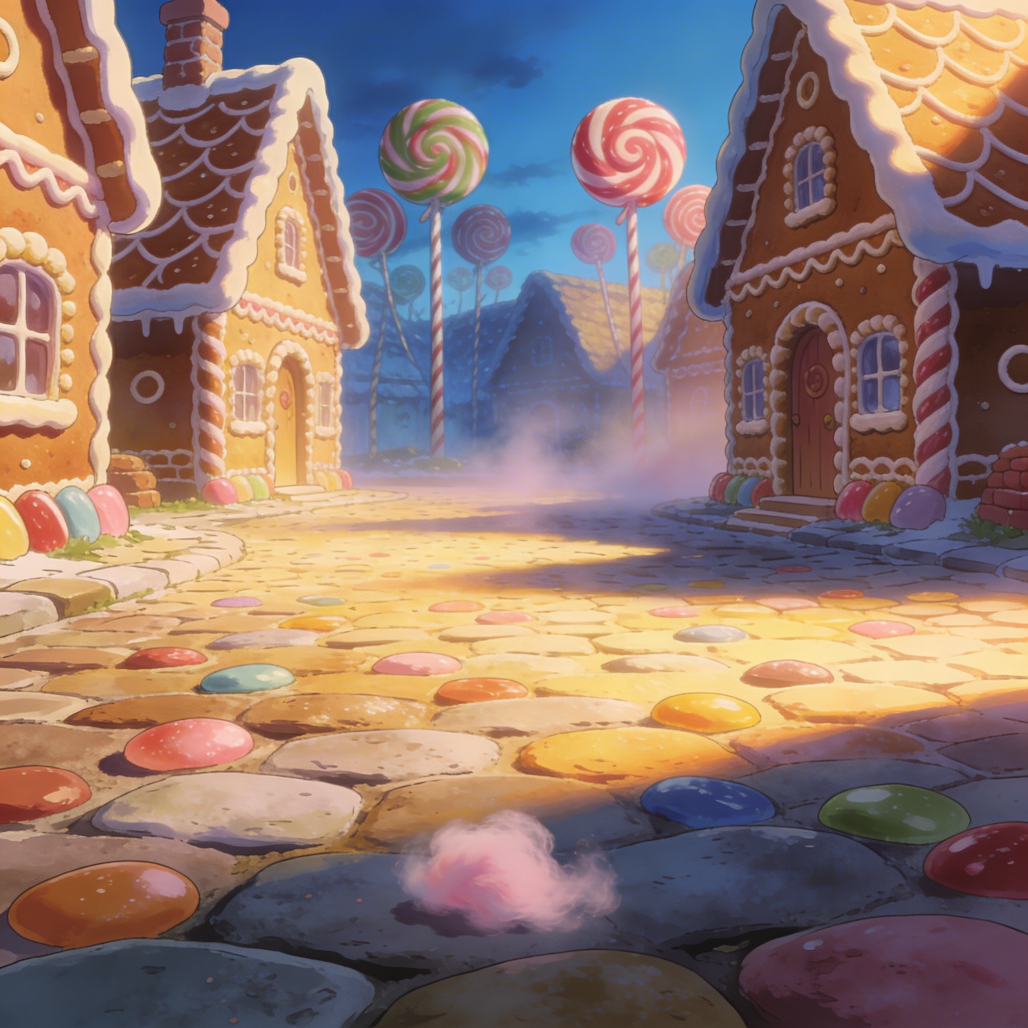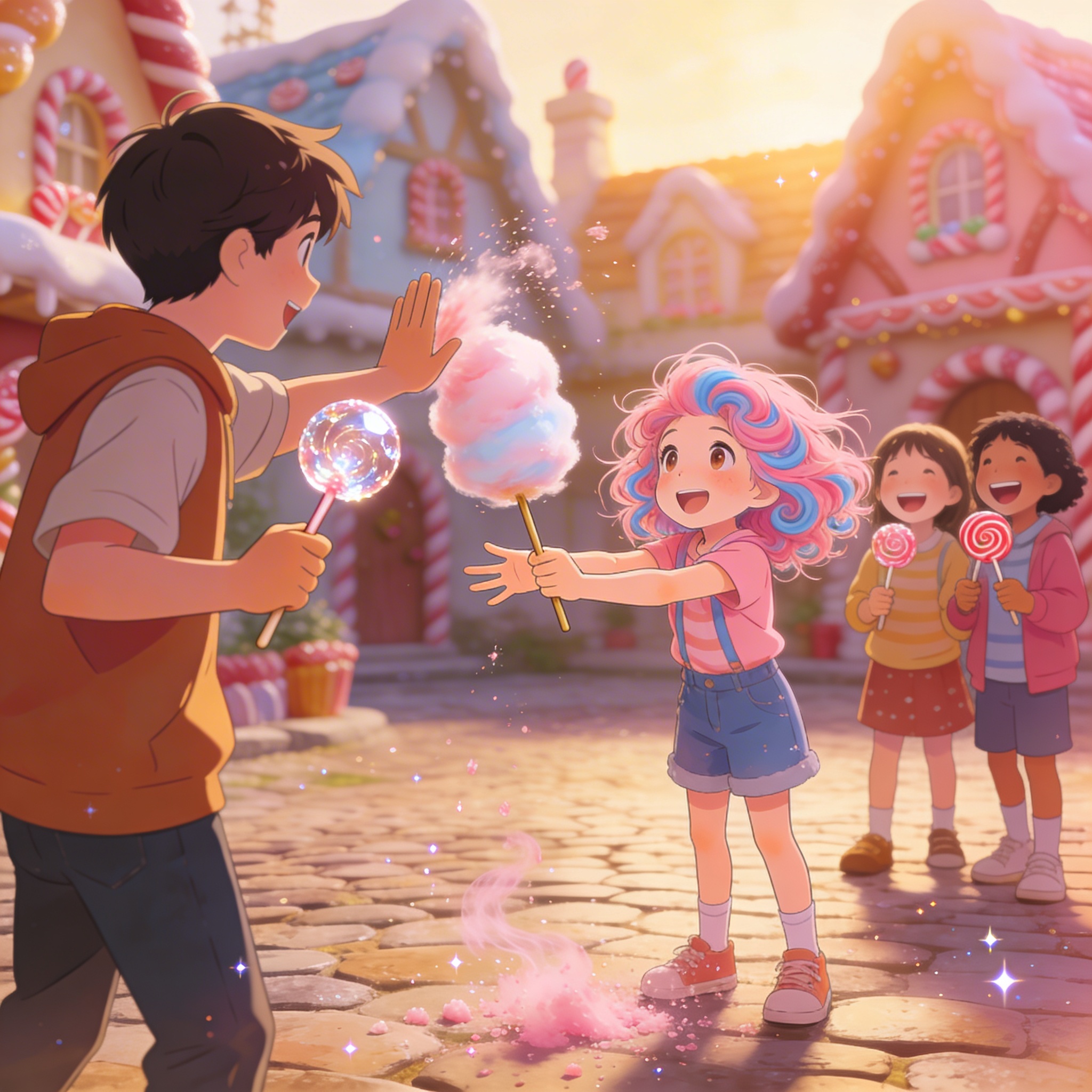 Same candy village. Outdoors — a courtyard between candy cottages. Golden afternoon light.