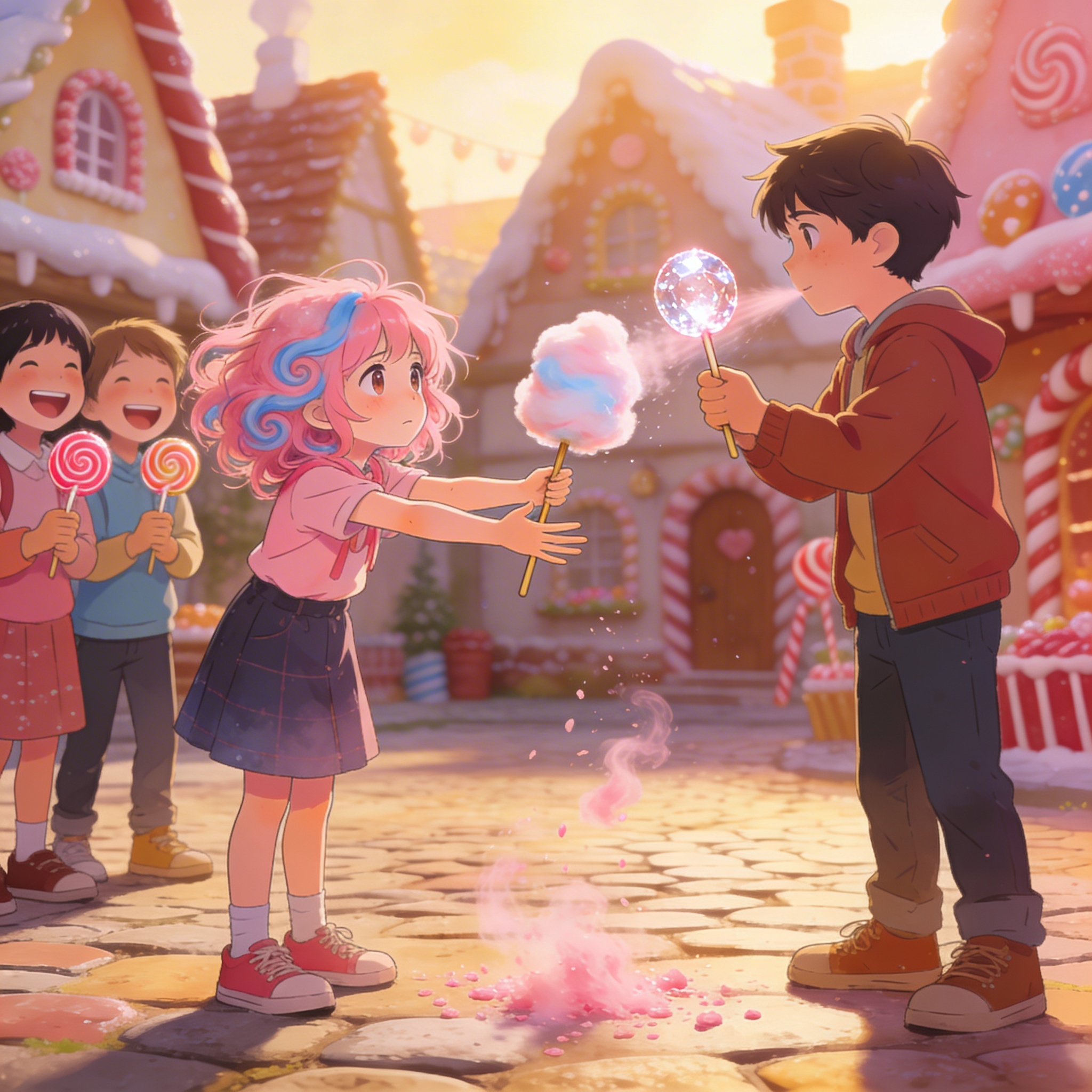Shot 01 (0:00-0:04): Medium shot. The cotton candy girl proudly holds out her cotton candy creation toward a group of other children. She extends it with both hands, offering, smiling hopefully. A bigger kid looks at it, then at his own perfect crystal lollipop, and SWATS her cotton candy off the stick with the back of his hand. The cotton candy tumbles to the cobblestone and dissolves into pink wisps. The other kids LAUGH. Their perfect lollipops gleam in the light, untouched. Camera slowly PUSHES IN during this moment.