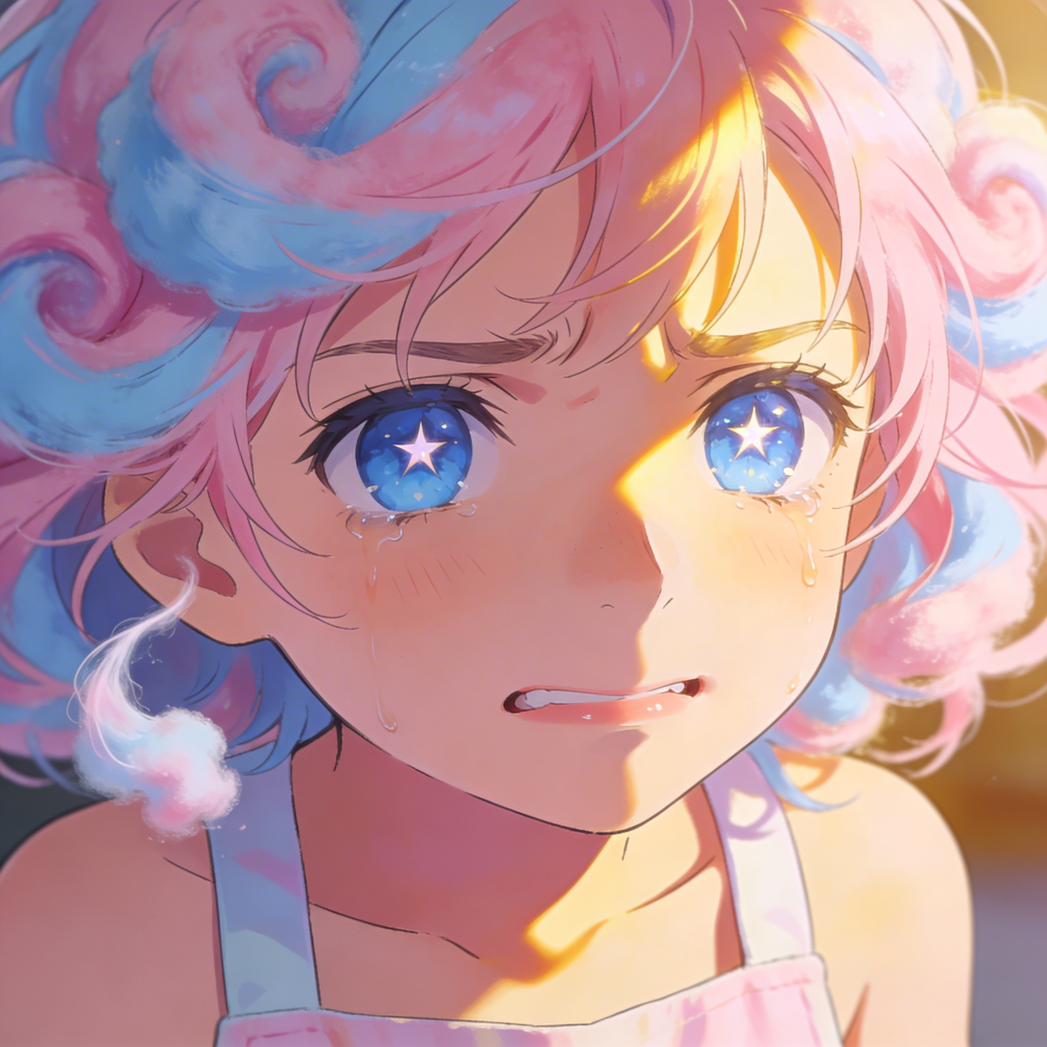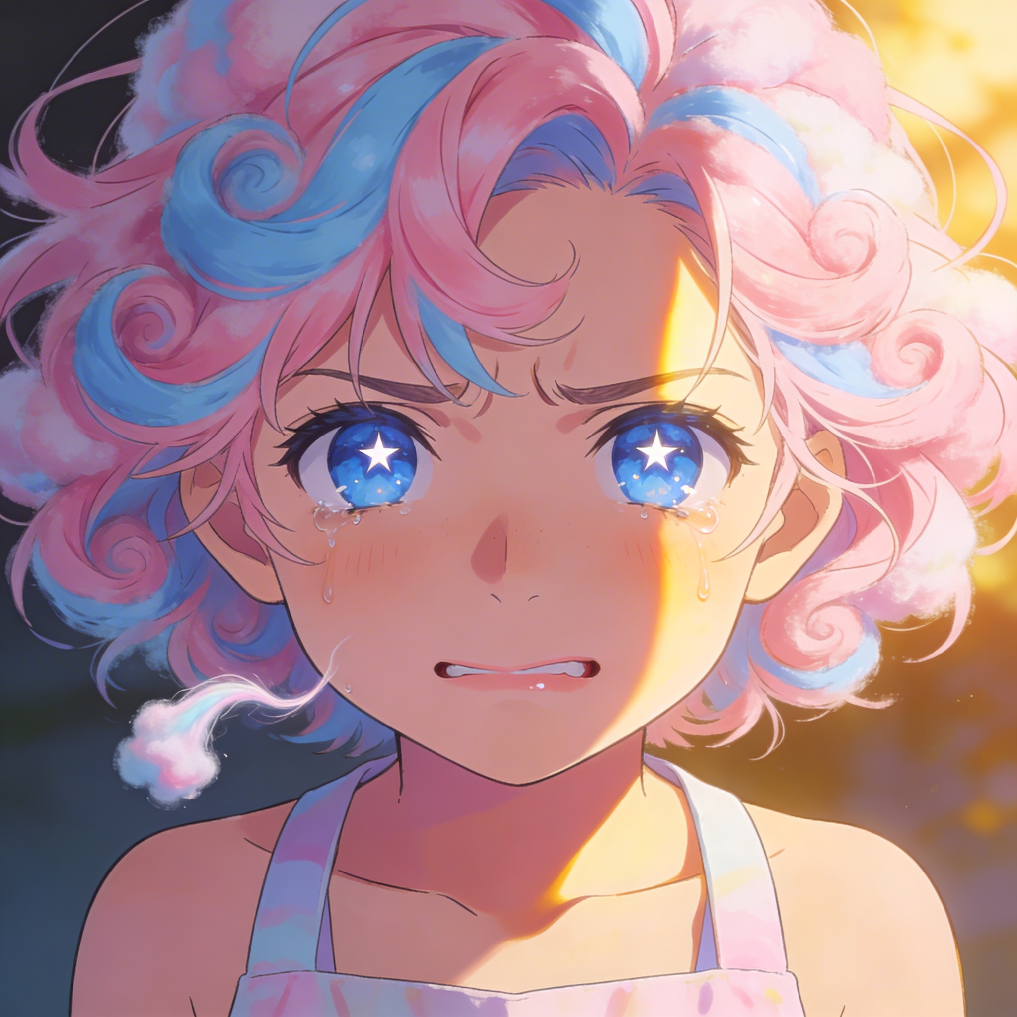 Shot 02 (0:04-0:07): Close-up on the girl's face. Her hopeful smile CRUMBLES in real time. Her blue eyes fill with tears but she REFUSES to cry. Her lower lip trembles. She clenches her small fists at her sides. A single cotton candy wisp drifts off her hair — fragile, dissolving. Camera HOLDS on her face. Still. Breathing. Fighting the tears.
